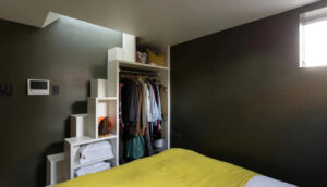 Hệ thống này cho phép tiết kiệm diện tích, kết hợp cùng kho lưu trữ lớn phía dưới giường, đủ chỗ đặt thêm một tủ đông. Lan can tay vịn cầu thang được làm tối giản, trong khi tường bên đối diện bố trí rãnh âm, hỗ trợ việc di chuyển.
